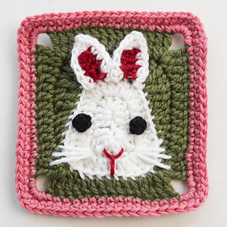 Transform the adorable bunny feature into the granny square, showcasing a charming little bunny face adorned with dimensional ears, tiny black button eyes, delicate whiskers, and a lovely pink nose.