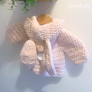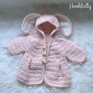 This crochet pattern is for a baby coat that can be made in 7 sizes, from newborn up to 24 months. The baby coat is made with bulky yarn making the cardigan chunky and warm, perfect as a winter jacket. With bunny ears on the hood and basic waist shaping, the baby coat looks adorable on baby girls. Also, the crochet baby coat is simply made with minimal sewing, you will need to sew some basic shaping, plus the bunny ears, tail, and buttons.