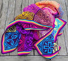 Dit patroon bevat vier verschillende vierkantjes, die samen een vrolijk project maken. De vierkantjes worden vanuit het midden gehaakt.