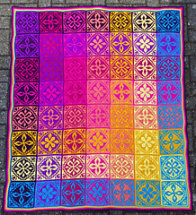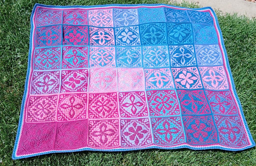 Elk blok heeft 17 toeren en eindigt met 33 steken (excl. hoeken) aan elke zijde.