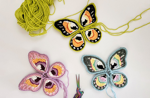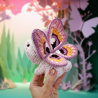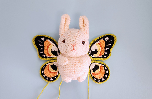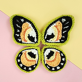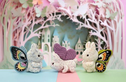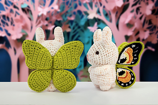 These wings were originally designed for Butterbun, and published as a standalone pattern by popular request. You can use them on amigurumi in the same fashion as Butterbun to create a fantasy hybrid creature, make an actual butterfly with them, or use them for non-amigurumi purposes.