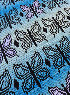 My new sample (in teal) was done with 3/DK yarn and 4mm hook, and measures 45” x 56” (no border). I used about 1350yds in Premier anti-pilling worsted (which is like most brands’ 3/DK weight btw) in “Sky Tones” with 900 yds black and 150yds in white for the tapestry bits.