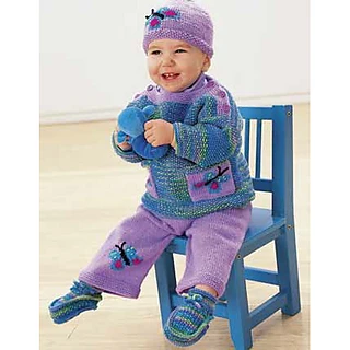This adorable butterfly set includes patterns for matching hat, pullover, pants, and booties knit in Patons Astra. Ages 6-24 months. (Patons Yarns)