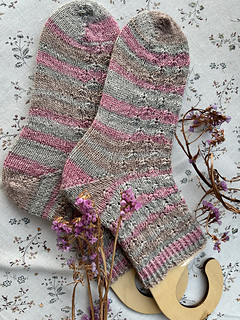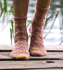 BUTTERFLIES SOCKS start with provisional cast on and are made toe up with a short row toe and a corresponding short row heel, made with the shadow wraps technique. The simple but attractive pattern is perfect for both solid and variegated yarns.