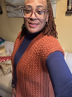 Construction: The vest is constructed by making two identical panels, which are then seamed together to form the main body. An added border along the bottom edge and neckline ties it all together. The stitch pattern is engaging and rhythmic, offering enough variation to keep experienced makers interested while remaining approachable and relaxing to work.