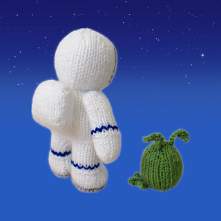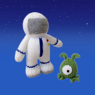 Buzz the astronaut has a close encounter with Zoff the alien! The astronaut pattern incorporates intarsia colour-work to make the helmet. The blue stripes on the astronaut’s suit are added after knitting using Swiss Darning (duplicate stitch) embroidery.