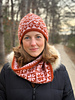 This set needs 2 hanks of each color for both hat and cowl, or 1 skein of each if you’re making just the hat or the cowl.
