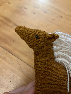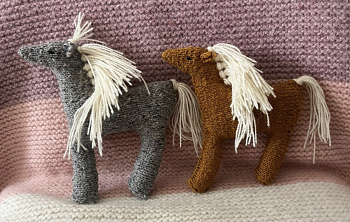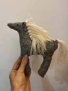 This is the pattern for the “Caballo Salvaje.” It is knitted in the round with circular needles using the magic circle technique. It begins at the nose, then the head is shaped with increases. Using backloop cast-on stitches, the body and legs are added, and then decreases are used to shape the neck. The legs are left on hold while the body is worked. Then purl stitches are picked up for the hind legs, and finally it is finished with short rows to shape the back end. The seams are closed with a Kitchener stitch, it is stuffed in sections, and lastly the mane and tail are added using a crochet hook.
