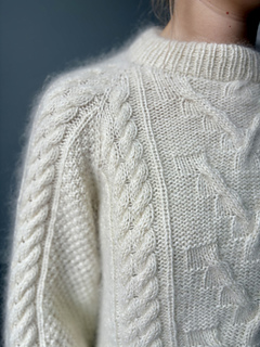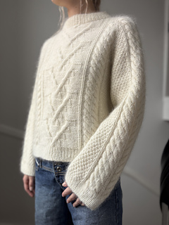The Cable Joy Sweater is a simple and harmonious sweater with a calm expression. The central cable forms a peaceful focal point, while the traditional cables along the sides and sleeves create balance. The fit is relaxed without being oversized. A modern