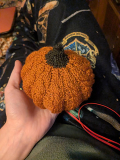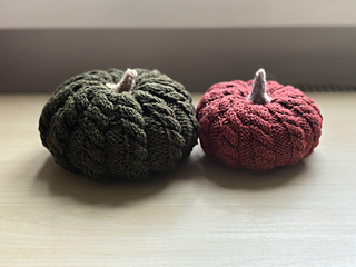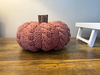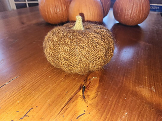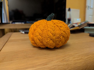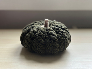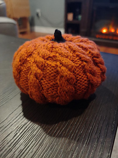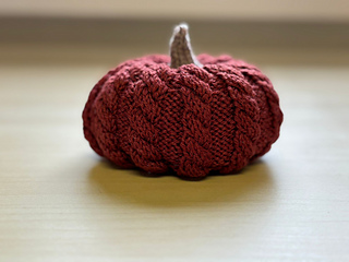 A simple cable knitted pumpkin knitted seamlessly bottom-up in the round.
