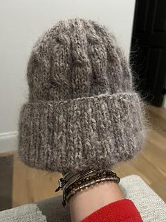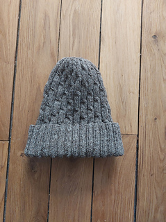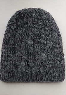 Striking beanie - easy construction. Nice for a beginner cable project as the cables go the same way and look impressive for little effort.