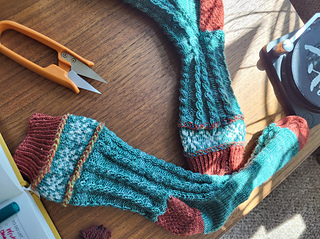 The pattern is written for adult (S,M,L) using fingering weight yarn in four different colors; one full skein of MC , with three contrasting miniskein colors.