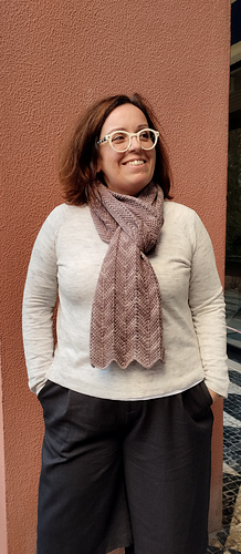 O Cachecol Zimbro é construído de ponta a ponta, usando o padrão chevron em crochet tunisino. Este ponto resulta da combinação de pontos simples, aumentos e diminuições, formando uma espécie de ziguezague.