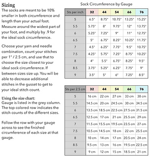 The sizing chart is based on gauge from 5 to 9 stitches per 1” / 2.5 cm. So they can be knit in light fingering to DK weight yarn. Choose your favorite yarn and needle combination for socks, and use your gauge to determine which size will best fit your foot. Find your gauge in the left column and follow it across that row for the finished sock circumference of each size.