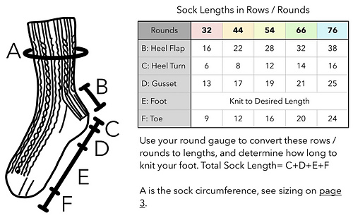 Ideally total sock length is also 10% shorter than your actual foot length. Convert the rounds listed in the schematic into lengths using your round gauge, then subtract those from your ideal sock length to calculate how long to knit the foot of the sock.
