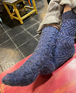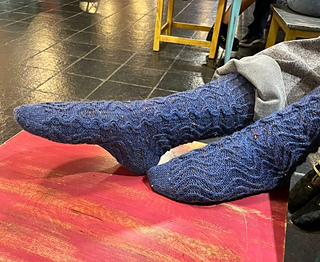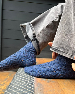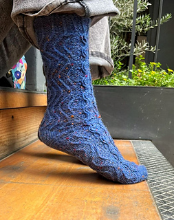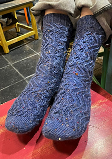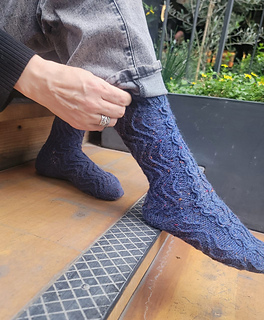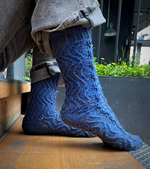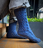 En el patrón, tanto en la parte de la pierna como en la del pie, te encontrarás con instrucciones distintas para cada pie, ya que este diseño, además del punto ondulante que se confecciona con cruces de un punto (que no requieren aguja auxiliar para trenzas), se caracteriza por una trenza en el empeine que está ubicada en lados distintos para cada pie.