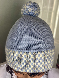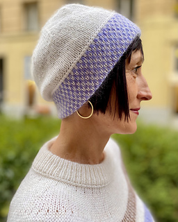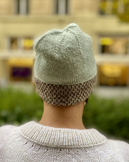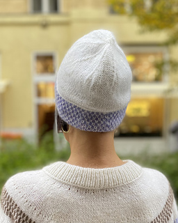 The design features gentle colour transitions framed by a subtle lateral braid, giving the beanie a distinctive yet understated character. The folded brim provides warmth and structure, while the smooth stockinette body lets the colourwork take centre stage.