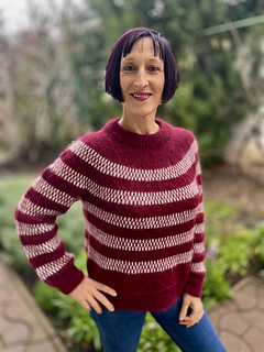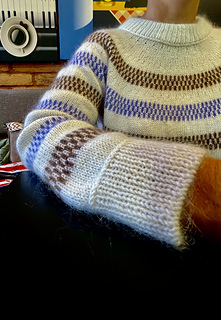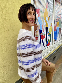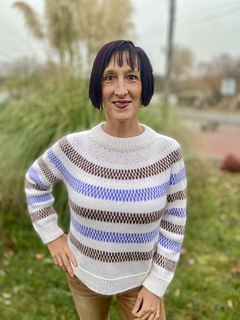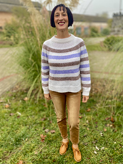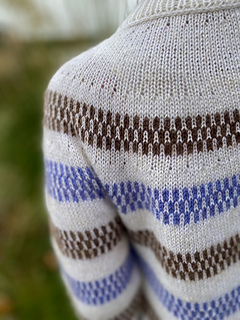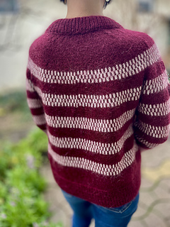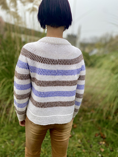 The design features simple yet striking single- and two-colour stripes, creating gentle movement across the yoke, body and sleeves. Subtle lateral braid details add texture and structure, framing the colourwork and giving the sweater its distinctive character.