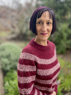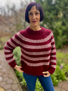 For my Bordeaux-based sample with beige stripes, I used Drops Nord (50 g = 170 m / 186 yards; 45% Alpaca, 35% Polyamide, 25% Wool), in shades 30-Bordeaux as the main colour and 29-marzipan as the contrast colour; held together with Drops Kid-Silk (25 g = 210 m / 230 yards; 75% mohair, 25% silk), in shades 70-Bordeaux as the main colour and 56-marzipan as the contrast colour.