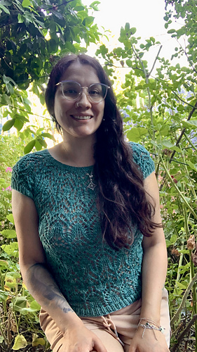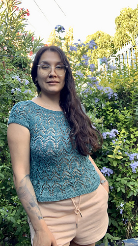 Las mangas cortas se trabajan también en circular y finalizan con un puño de elástico simple, mientras que el cuerpo termina con un elástico que enmarca el diseño sin quitarle fluidez. Es un proyecto entretenido y rítmico, ideal para quienes disfrutan tejer calados y observar cómo el patrón cobra vida vuelta tras vuelta.