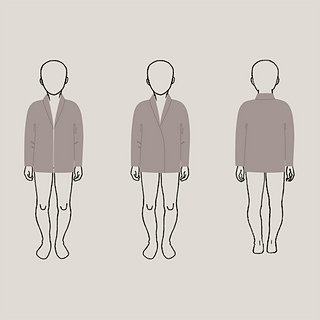 Shaped shawl collar. Straight body profile, with optional waist shaping. Sloped shoulders, tapered raglan sleeves, adjustable hem length, adjustable front edges that can meet at the centre or overlap.