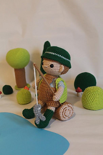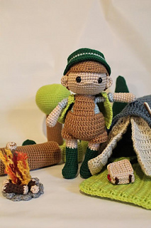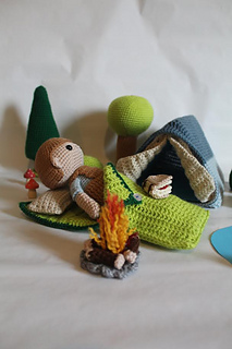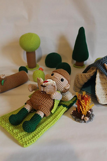 This complete amigurumi camping pattern includes everything you need to bring the forest to life: from the fisherman and tent to the campfire, trees, sleeping bag, bushes and more.
