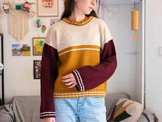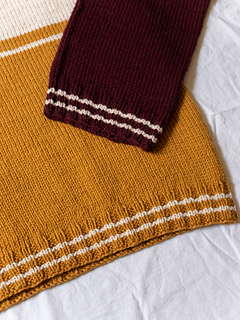 Campus Days is a sweater with a sporty and vintage vibe, knit top down, in the round. Using 3 colors, it’s a fun and accessible knit, even for beginners. The pattern provides two sleeve options : a wider one and a more tapered one.