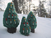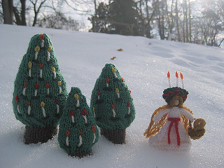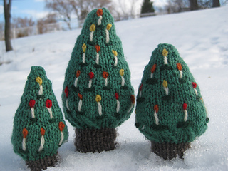 They are knit in the round on dpns. The bottom is left open so they can be stuffed and stand independently. The smaller one also makes a nice hanging ornament. I think the trees would make a nice blank canvas for other embroidery. Maybe some Lazy Daisies in the spring, or some French Knot apples for the fall. Maybe even a white tree with blue snowflakes! All you need is some time spent dreaming and away you go!