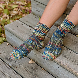 This pattern can be knitted with any sock yarn. Depending on the size of sock you will need two 30 to 60 g balls. Both yarns can be identical, but there can be more or less contrast between them. The yarn can be solid coloured, variegated or gradient (in this case you can use the yarn from both ends of the ball).