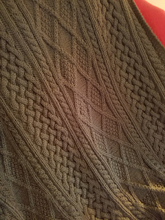 There are two basic patterns in this throw, “Celtic Plait”, which forms 3 panels, and “Trellis with Moss”, used for 2 panels. The patterns are separated with a simple four-stitch cable and rib pattern, slightly different on the edges. Once you have done a few rows, you will probably not need to refer to the simple cable and rib pattern, but can just “read” your stitches and make the cable every four rows. I have coordinated the patterns so that they mesh, with a 24 row repeat.