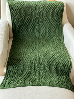 A cozy cable-rich lap blanket, consisting of a single wide cable panel with I-cord edges and twisted tassels.
