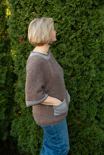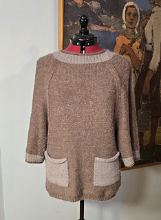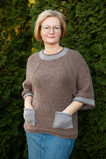 The Cappucino with pockets sweater is a trend color 2025 piece, warm and cozy everyday step supporter round neckline, raglan shape and 2 pockets. It is easy to knit, requires only a base techniques. The Cappucino with pockets sweater is worked in 4 pieces with adds of neckline and pockets. The middle of front is shorter approximately 5.5 cm. First, the body is worked in back + front piece + 2 arm pieces and sew together. The stitches of neck line joined and worked with cust on method around neck line. Techniques used: purl and knit.