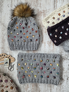 There are coordinating headband and hat patterns available, too. Yarn and pom poms for these projects are available on my website: www.northroadknits.com