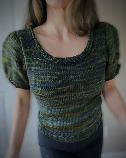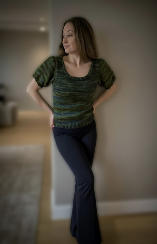 This delightfully feminine, form-fitting sweater is knit in the round from the bottom up to the armholes. It is meant to hit at the hip, but the length is easily adjustable to your preference.