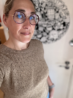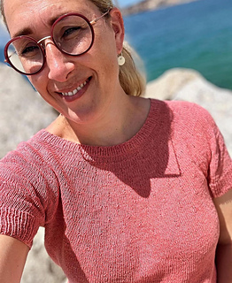 Carlas sommer tee, der har et rundt bærestykke strikkes oppefra og ned. Denne sommer tee er et begyndervenligt projekt med mulighed for flere variationer.