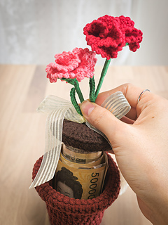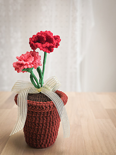 This crochet pattern includes step-by-step instructions and diagrams to make a beautiful carnation flower in a pot.