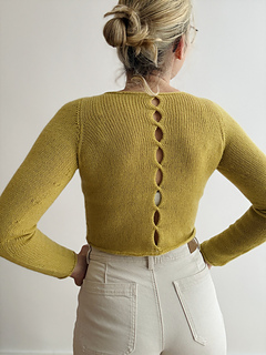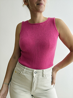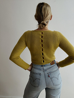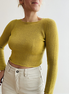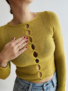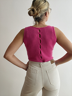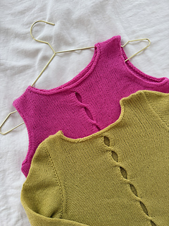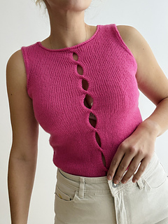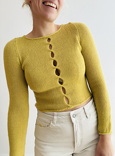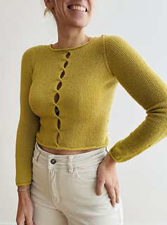 The fit of the sweater is close to the bust, emphasizing the female body shape by the neutral to negative ease. Additionally, the highlight of the design are the cut-outs flowing along the middle of the front parts – or at the middle of the back part in case you decide to wear your sweater the other way round. The length is cropped, making the design extra cool and stylish, especially in comparison to high waisted jeans and wide trousers. The sweater can be worked as a sleeveless tank top as well. Therefore, you will need around (2) 2 | 2 | 2 (3 | 3 | 3) 4 | 4 |4 balls less than recommended.