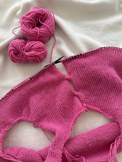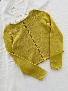 The sweater is worked top down in one piece in stockinette stitch: First, the front parts are worked with cut-outs shaped with cable crossings. The front parts are worked separately because of the cut-outs, you work increases to shape the round neck and increases to shape the armholes. When working the cable crossings, the front parts are joined for a few rows. When the front parts have reached the armpits, the back part is worked in one piece by picking up stitches along the shoulder of the front parts. The back part is worked in stockinette stitch without cut-outs, but with increases for the round neck (to make the design reversible) and with increases for the armholes. When the back part has reached the same length as the front parts, all parts are joined under the armpits. The sweater is now worked back and forth in rows with cut-outs along the front parts. This means, that the sweater is worked for 2 rounds in the round, before you will again work in rows. Finally, all stitches are bound off with an I-cord edging.