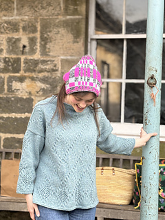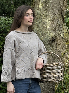 Features the Tree of Life design in lace and travelling cables, neck gussets and provisional cast on.