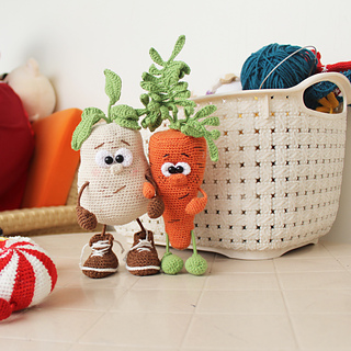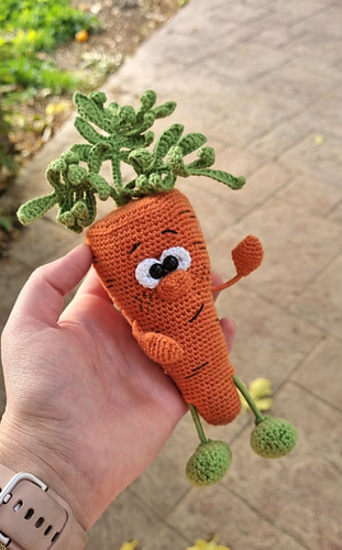 This crochet pattern provides detailed written instructions for creating the carrot toy, including the body, arms, legs, branch with leaves.