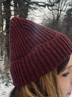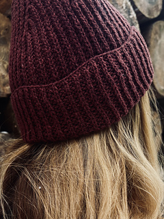 The hat is knitted from the bottom up in half brioche pattern (fisherman´s rib). To work the wave-like cuff, German Short Rows are knitted with brioche purl stitches. The hat can also be knitted without the wave-like cuff. After finishing the cuff brioche knit stitches are done until the end of the piece. The length of the hat can be individually adjusted before working the decreases.