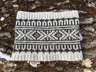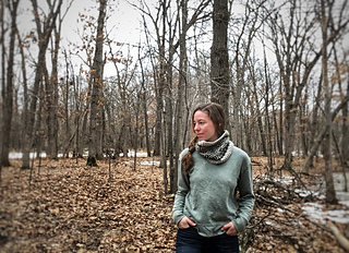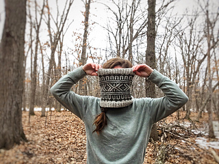 A 16” US 9/5.5mm circular needle is recommended for this cowl. Two skeins of Juniper Moon Patagonia Merino in contrasting colors were used the the sample, though any DK weight should work just fine.