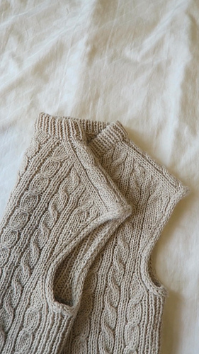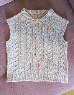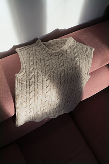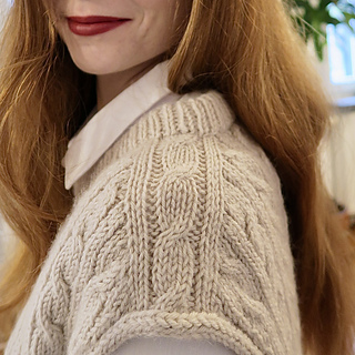 Der Cassie Slipover ist ein von oben nach unten, mit Sattelschulter gearbeiteter Slipover. Er besticht durch sein Rippe-Zopf Muster und dem Zopfdetail auf der Schulter. Die Bündchen und der Kragen ist in 1x1 Rippe gestrickt. Die Armausschnitte haben einen I-Cord Rand. Die Schulter ist bewusst leicht überschnitten.