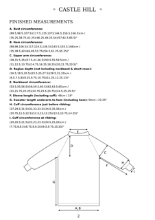 Castle Hill is intended to be worn with about 10 to 15cm / 4 to 6” of positive ease at bust and/or hem. A list of measurements and schematic is provided on page 2.