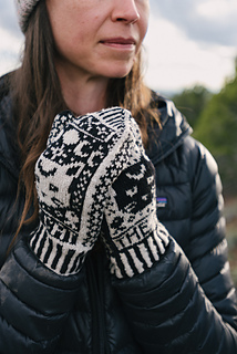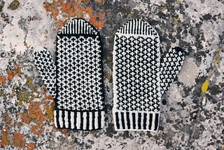 The sample mittens are knit in the colorways Bone (cream) and Obsidian (black).