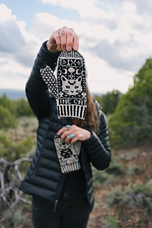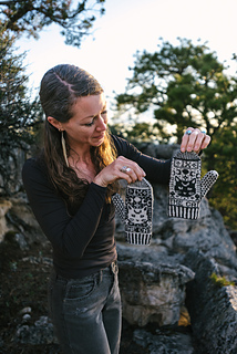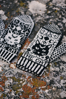Design & Construction: The Cat Tarot Mittens feature an allover colorwork design inspired by mystical, cat-themed tarot imagery. Worked from the bottom-up, mittens begin with a corrugated ribbed cuff before transitioning into the main colorwork motif, which is knit in traditional stranded colorwork. Charts include instructions for working the colorwork with optional ladderback jacquard to manage long floats on the inside of the fabric. A thumb gusset is shaped with increases and put on hold while the hand is completed. Stitches are then returned to the needles to finish the thumb.