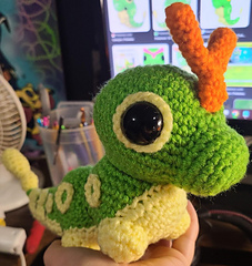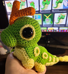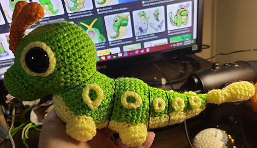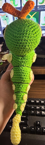 If you have any questions about this pattern, please feel free to message me. This pattern may not be beginner-friendly. This is a crochet pattern for the Pokemon, Caterpie. 8.5 inches long.