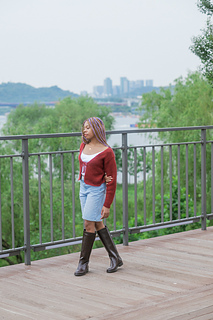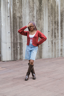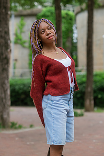 Panels and sleeves are worked from the bottom up separately and then seamed together using mattress stitch. The panels have rounded corners and achieve their full width using Tunisian full stitch increases. Sleeves have a tapered effect. The cardigan is meant to be cropped.