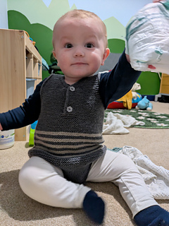 The romper is knitted from the top down in garter stitch and also features I-cords on all the edges and along the sides of the body.