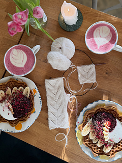 The set in the pictures is knitted in Merino and Soft Silk Mohair (Color: Cream) from Knitting for Olive.